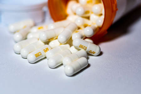 Pharmaceutical medicine pills and capsules spilling out of pill bottle on white surface