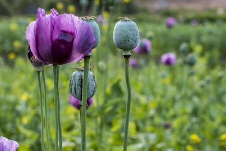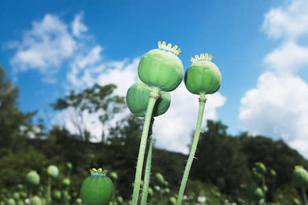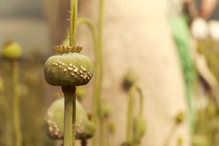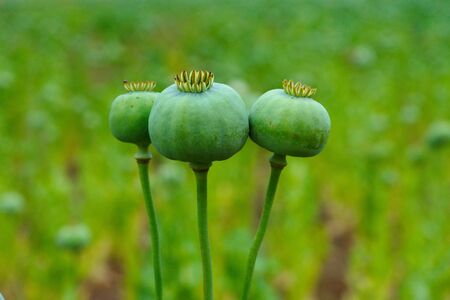 Opium poppy buds in the field, close-up, selective focus