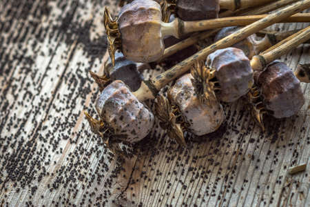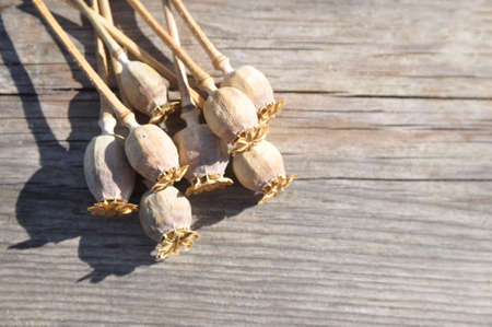 Poppy heads on wooden background.