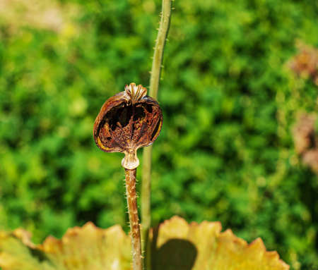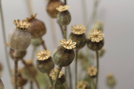 poppy flower capsule. Long dry stalk of poppy seed waiting for harvesting