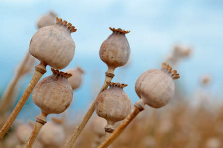 Detail of dry tree poppyheads on the field with shallow focus against blue sky