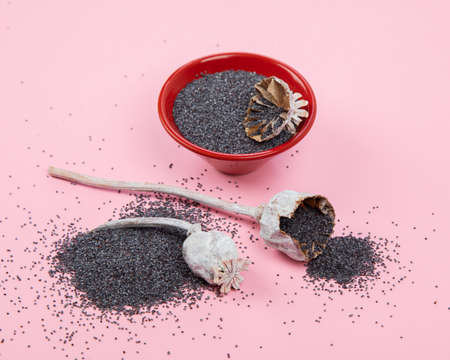 Composition with poppy seeds on pink background. organic food concept.