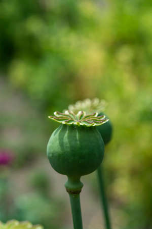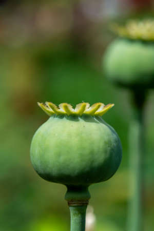 Green unripe capsules of opium poppy, selective focus