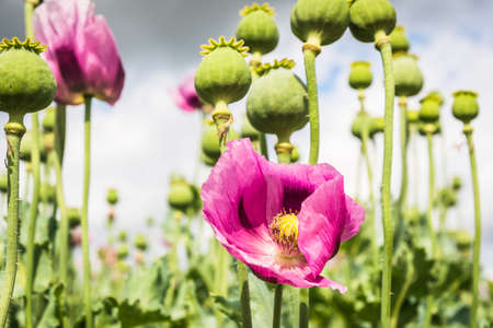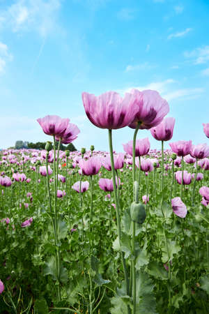 Flowering purple poppy seed flowers (Papaver somniferum). Agricultural field of breadseed poppy.