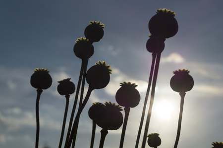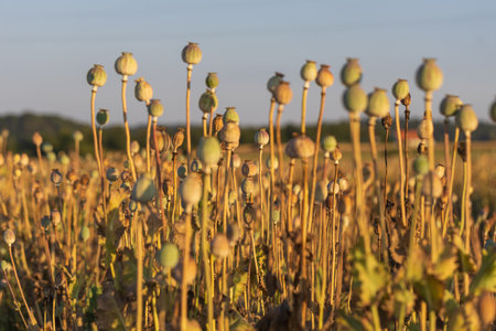 opium poppy seed heads on sunset, hashish,