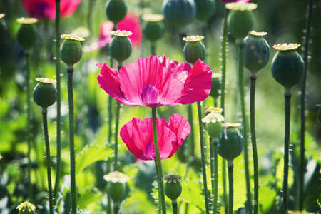 Beautiful pink poppies in blossom on a summer meadow