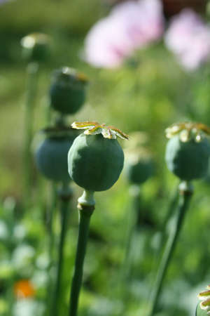 Green poppy boxes with seeds closeup in the garden in sunlight