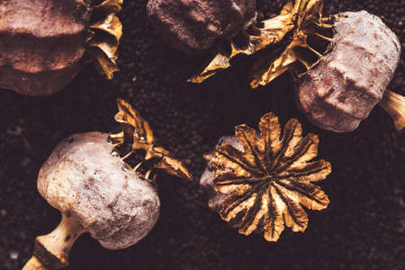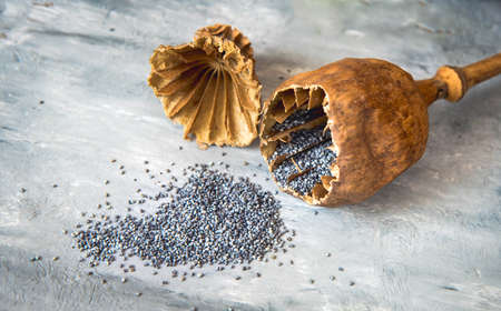 Homemade grown poppy heads, opened head and spilled poppy seeds.