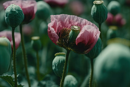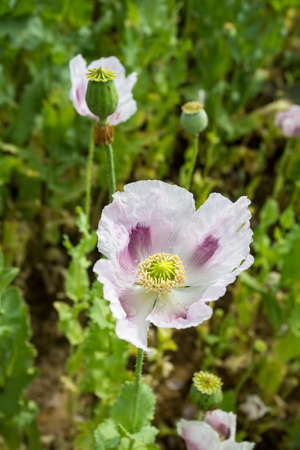 Detail of opium poppy papaver somniferum with flowers background.