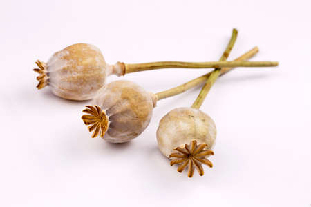 Three dry poppy heads on a white background. Close-up.