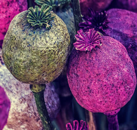 Opium poppy heads, close-up. Papaver somniferum, commonly known as the opium poppy or breadseed poppy, is a species of flowering plant in the family Papaveraceae.