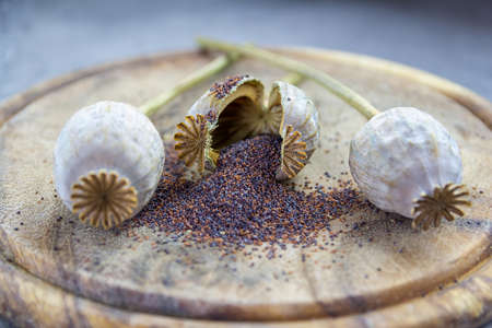 Close up of poppy seed plant on kitchen desk and circle breadboard