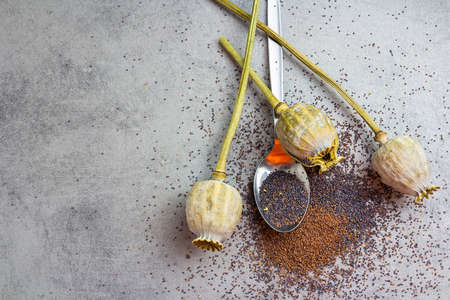 Poppy seed plant and seed on spoon on kitchen desk. Top view