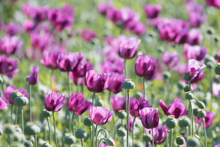 Flowers of purple colored poppies bloom in a wild field. Beautiful field of poppies with selective focus. colorful purple poppies in soft light. Poppy seeds. Natural drugs. Glade of red poppies. Beaut