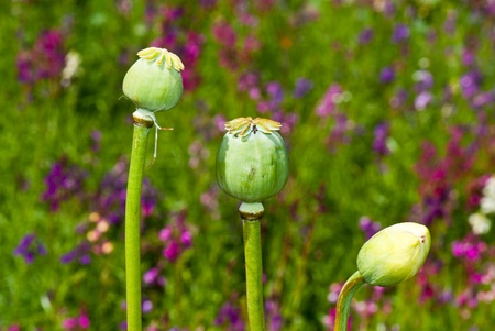 Poppy seed pods in flower meadow with shallow depth of field