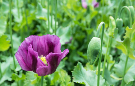 Purple bloom and green bud with stems and leaves in field detail. Papaver somniferum. Closeup violet flower head and fragile petals of plant cultivated for edible seeds