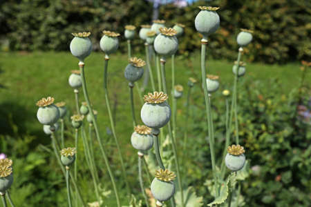 Poppy with green heads grows in the garden.