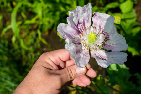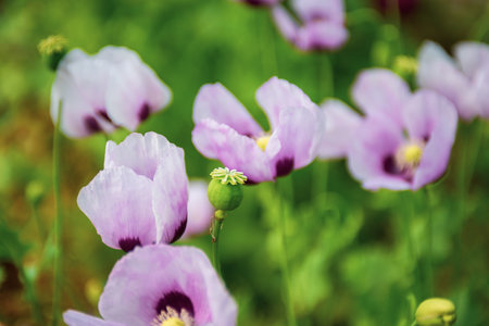 Opium flowers, which are covered with dew in opium fields at dawn.