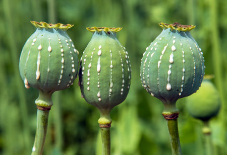 three immature poppy heads with drops of milk latex on green background