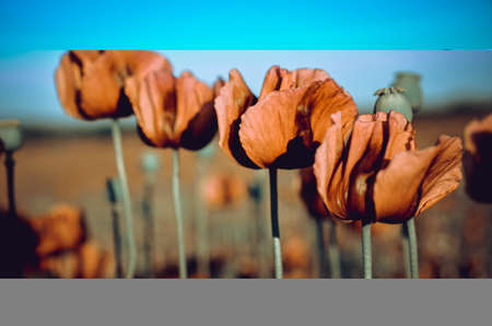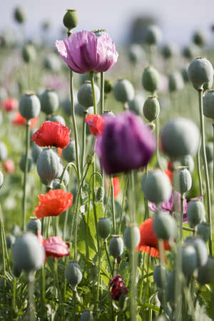 Opium poppy field Flower and Seeds capsules Close up Poppies Agriculture Filds