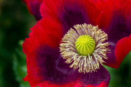 Amazing close up of the details of a bright red or magenta and purple Opium Poppy flower in the spring.
