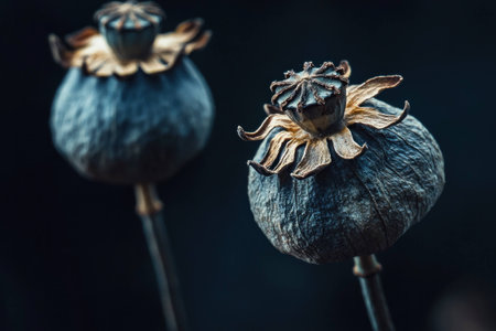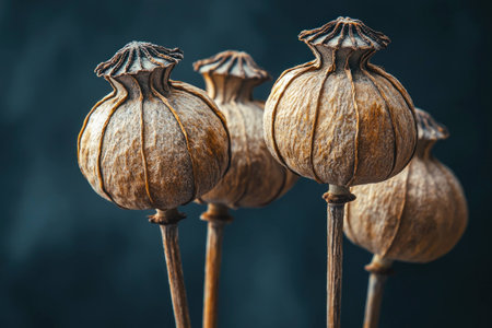 Dried poppy seed heads with intricate textures and natural patterns, arranged elegantly against a dark textured background. Focus on botanical beauty and nature.