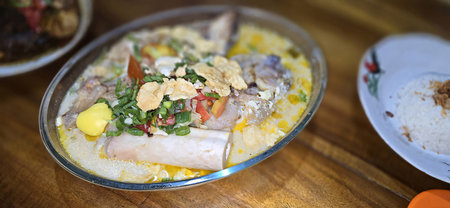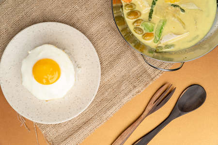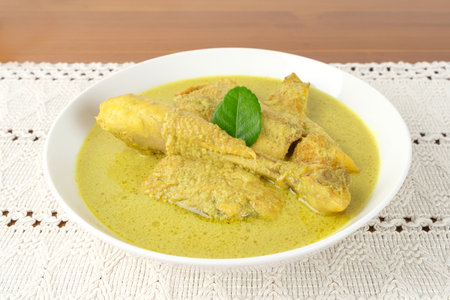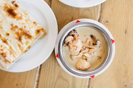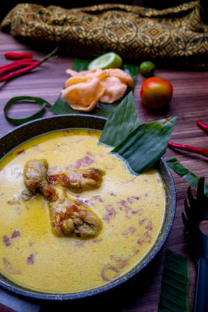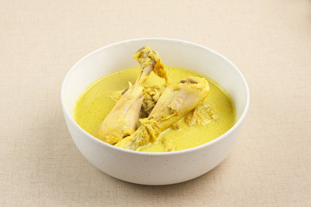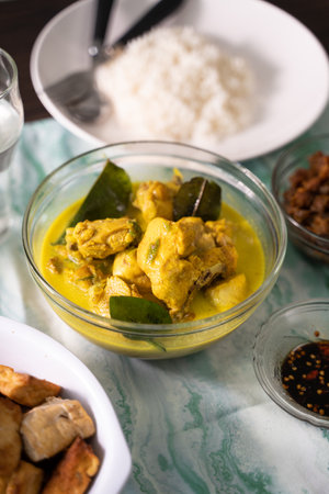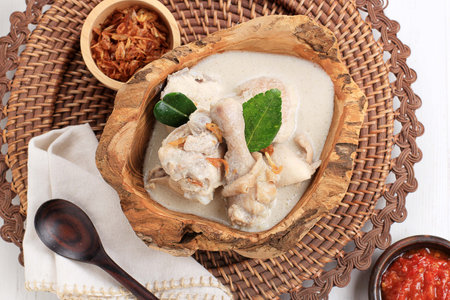 Top View Opor Ayam Putih or Chicken White Curry, Traditional Indonesian Food made from Chicken Cooked with Coconut Milk and Spices, Served to celebrate Eid al Fitr or Al Adha.