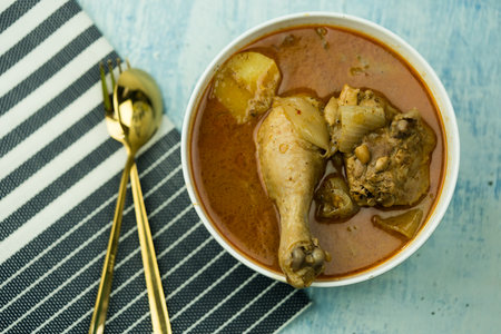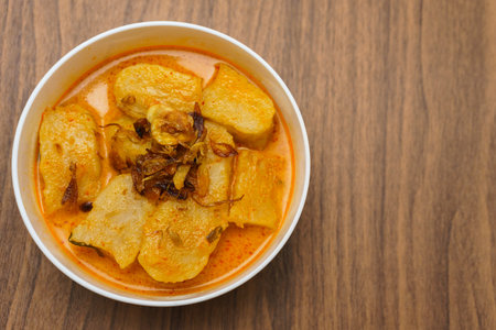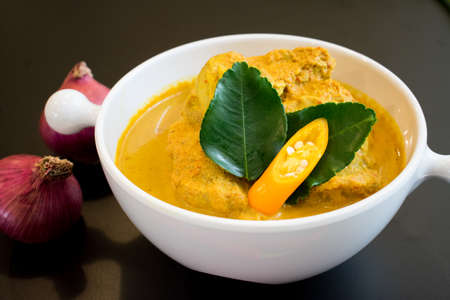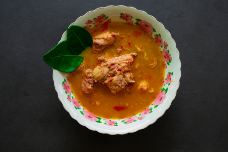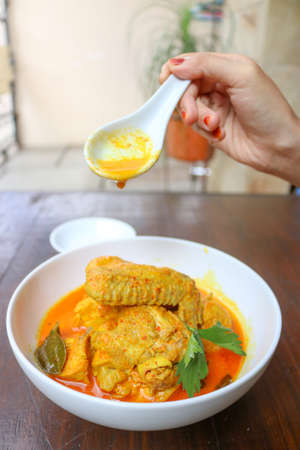 chicken curry or kari ayam served on bowl, isolated on wood background