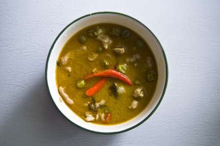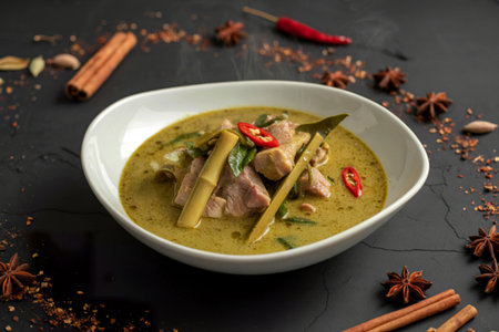 Asian food pieces of chicken stew in coconut milk with spices close-up in a bowl on the table. horizontal