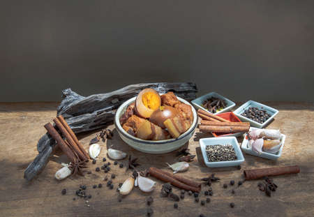 Spices and herbs seasoning containing cinnamon, star anise, garlic and black pepper in ceramics bowls on brown background. Organic herbal and healthy concept. Selective focus.