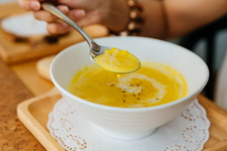 Female Hand Scooping Classic Pureed Pumpkin Soup topping with Milk, Cream and Pepper with silver spoon.