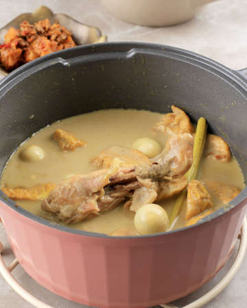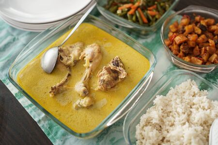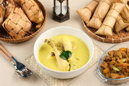 Fresh Cooked Opor Ayam (Indonesian Yellow Chicken Curry) for Lebaran Menu, Usually Served with Ketupat, Sambal Goreng Ati Kentang, and Semur Telur. Popular Dish for Eid al Fitr
