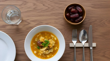 Dates soup in a bowl with spoon and fork on wooden table, health meal prep, health measurement, measuring health-care, for sport equipment, healthy food,