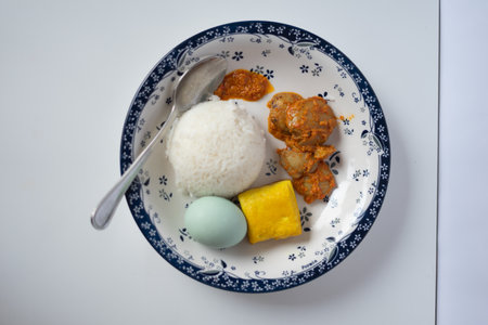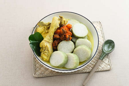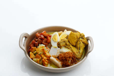 Lontong Opor, Indonesian Traditional Breakfast or a Eid Menu. Opor made from Chicken Cooked with Coconut Milk and Spices. Served to Celebrate Eid Adha and Eid Fitr. Isolated on White