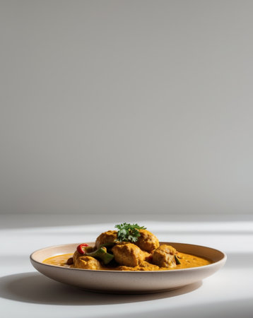 A close-up shot of a delicious chicken curry with tender pieces of chicken in a rich, flavorful sauce, garnished with a fresh green leaf.