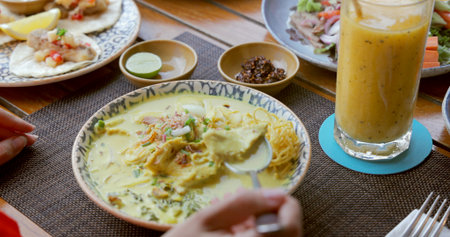 Authentic Burmese coconut noodle soup with fresh herbs on table. Asian