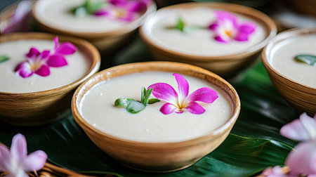 This image showcases a delicious creamy dessert presented in rustic bowls, adorned with vibrant edible flowers, evoking a tropical and inviting atmosphere.