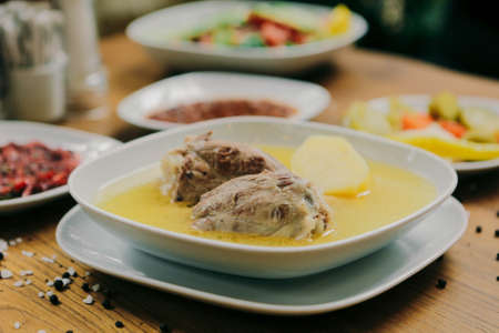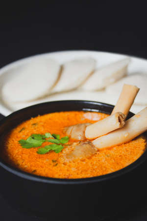 sop kaki kambing a traditional food from Betawi, Jakarta Indonesia, made from mutton or lamb, offal, spices. isolated on black background.This food is like lamb stew on black background