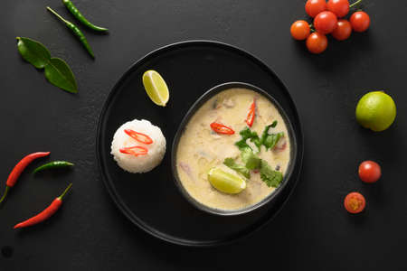 Asian Tom Kha Gai soup. Spicy coconut with chicken, cherry tomato.