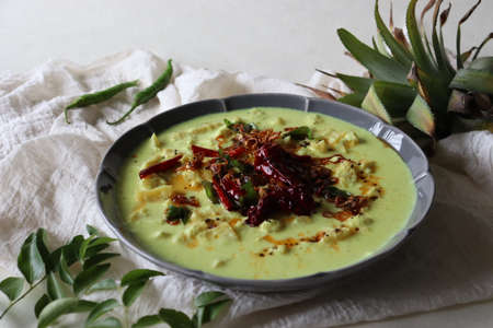 Pineapple pachadi. A yogurt based sweet and spicy curry made with pineapple, coconut, mustard seeds and curd. A side dish for Kerala meals. Shot on white background.