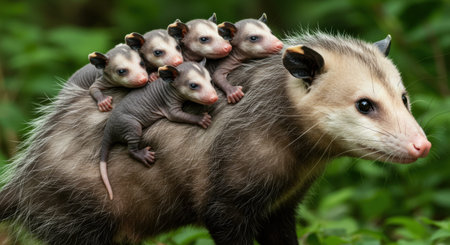Mother opossum carrying adorable babies through lush greenery.