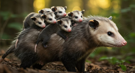 Opossum family in the forest with setting sun shining. Group of wild animals in nature.