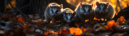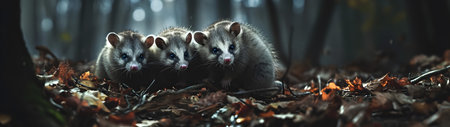 Opossum family in the forest with setting sun shining. Group of wild animals in nature. Horizontal, banner.