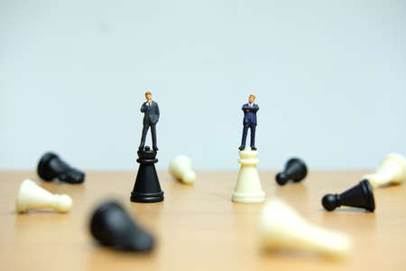 Two miniature businessman standing on wood block and face to face and black and white chess pieces on the back. Background business concept and strategy concept