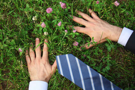Man's hands, grass, clover flowers,tie