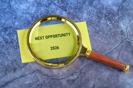 A golden magnifying glass rests on a bright yellow card that presents the phrase Next Opportunity followed by the year 2026, symbolizing important future prospects and discoveries.