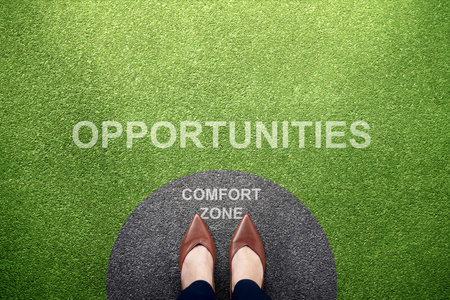 Comfort Zone Concept. Woman Standing on Circle Concrete Floor, Ready or Start to Steps outside for New Opportunities. High angle View. POV view