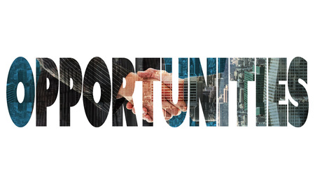 The word opportunities and business people shaking hands