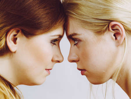 Two young women looking serious at each other. Friendship, difficult relationship.