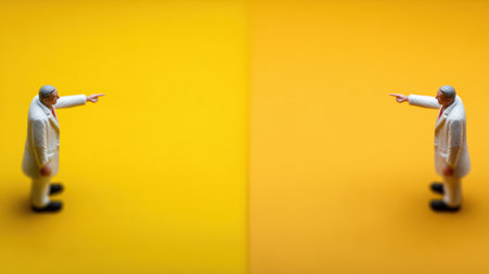 Two identical figures stand opposite each other, each pointing towards empty space in a marketing setup with a bright yellow background.